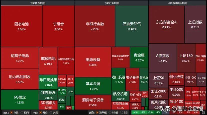 盘面上,固态电池、钠离子电池、麒麟电池、动力电池回收、电源设备、电子器件等板块大涨,石油天然气、贵金属、基本金属、港口航运板块走弱。