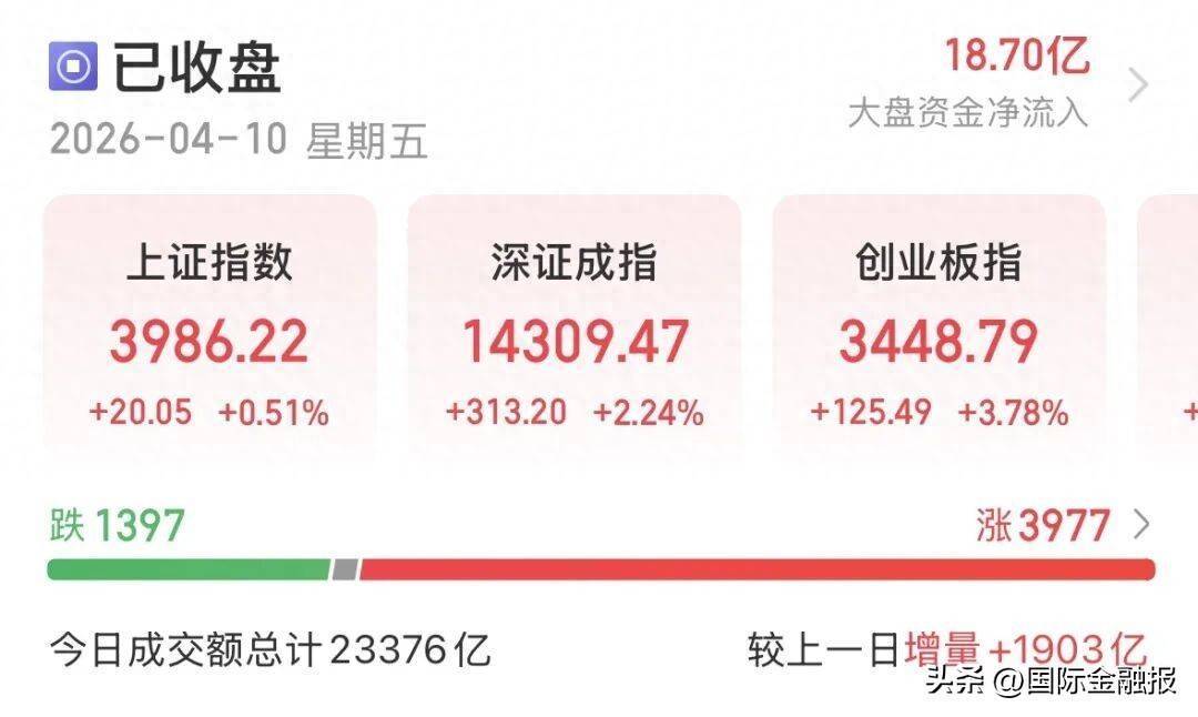 4月10日,A股赚钱效应不错,沪指盘中重返4000点上方,创业板指涨近4%,3977只个股收红,量能放大至2.34万亿元,电力设备、电子、通信板块领涨,非银金融板块走强。